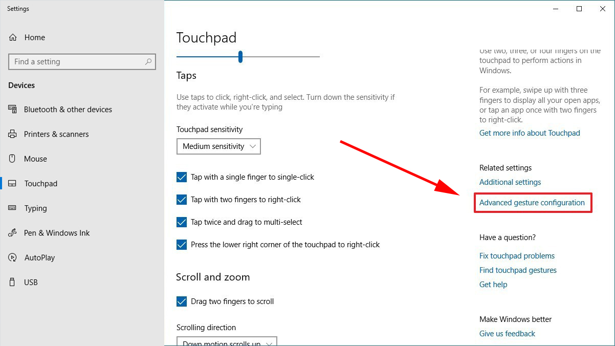 Under "Related settings," on the right side, click the Advanced gesture configuration link.