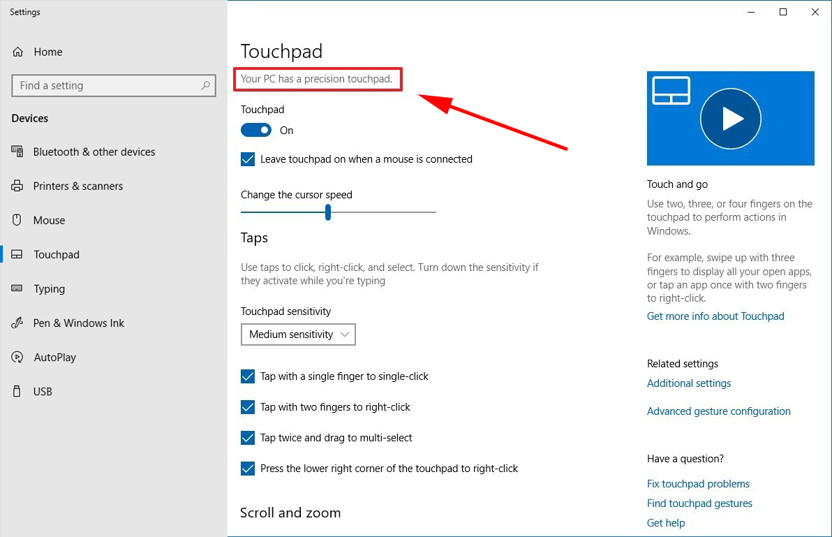 - Under "Touchpad," it should read: "Your PC has a precision touchpad.