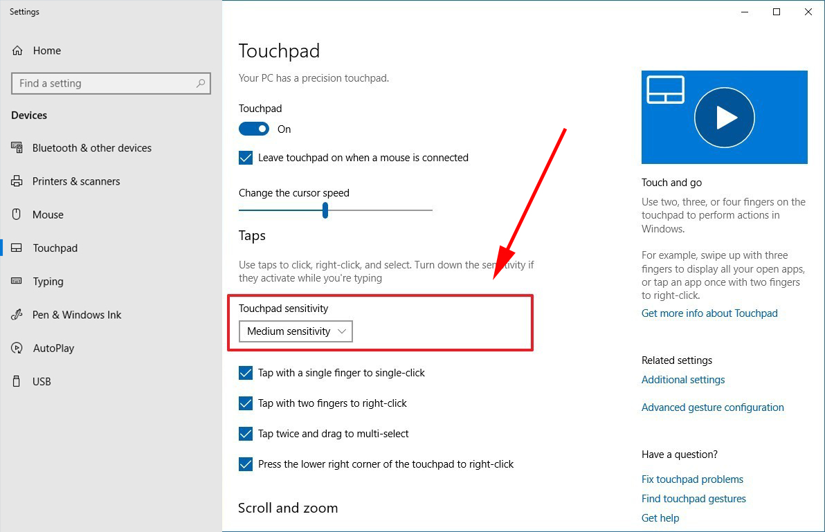 Under the "Taps" section, use the Touchpad sensitivity drop-down menu to adjust the sensitivity level of the touchpad. Options available, include: